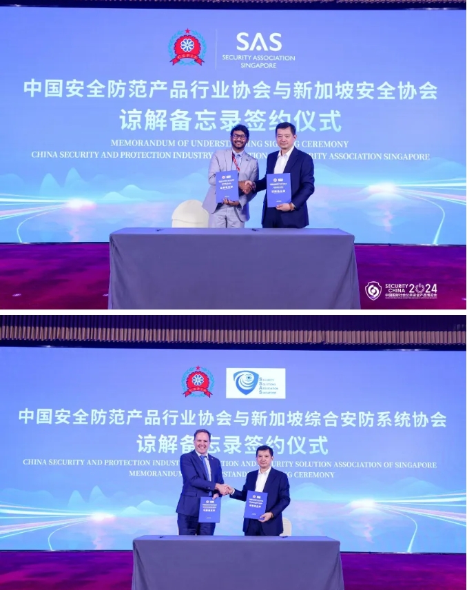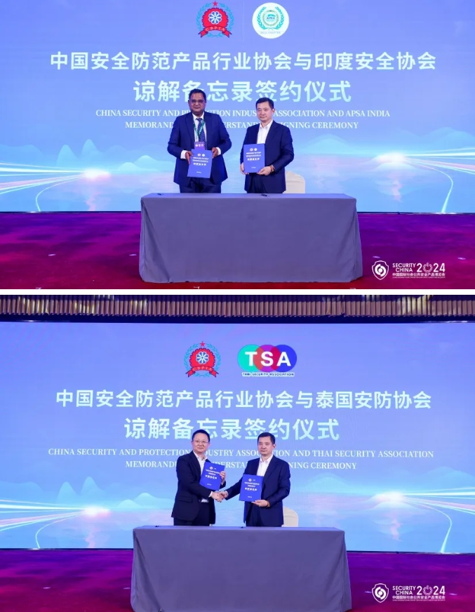 當前,中國安防企業(yè)正以迅猛之勢進軍國際市場,成為推動全球安防產(chǎn)業(yè)發(fā)展的重要力量。為了給優(yōu)質(zhì)安防廠商、產(chǎn)品、技術(shù)和解決方案“走出去”“引進來”搭建對接平臺,活動上特別設置了2024安博會諒解備忘錄簽署儀式環(huán)節(jié),王楠秘書長分別和新加坡安全協(xié)會會長喬舒亞·托馬斯議員、新加坡綜合安防系統(tǒng)協(xié)會會長杰森·庫萊克先生、印度安防協(xié)會會長迪潘庫爾·米塔爾博士、泰國安防協(xié)會會長楊艷峰先生簽署諒解備忘錄。